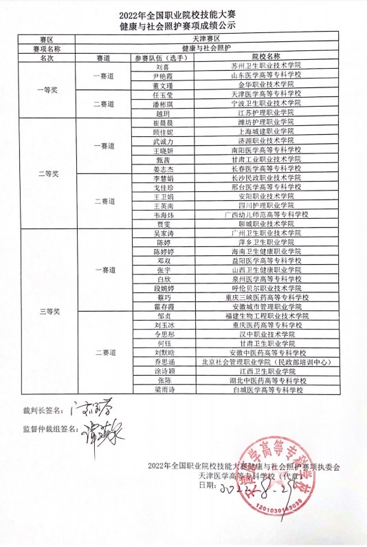 本次賽項(xiàng)于2022年8月26-28日在天津醫(yī)學(xué)高等??茖W(xué)校舉行,吸引了來自全國28個省、自治區(qū)、直轄市的60個院校、60支代表隊的選手和指導(dǎo)老師參賽。全國職業(yè)院校技能大賽高職組健康與社會照護(hù)賽項(xiàng)共分為兩個賽道,每個賽道設(shè)個人一、二、三等獎,獲獎比例分別為 10%、20%、30%,獲得一等獎參賽選手的指導(dǎo)教師將由大賽組委會頒發(fā)優(yōu)秀指導(dǎo)教師證書。